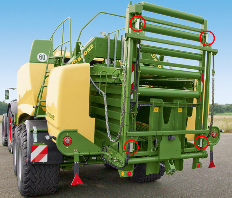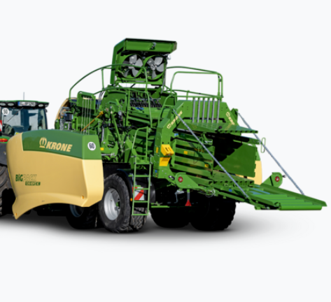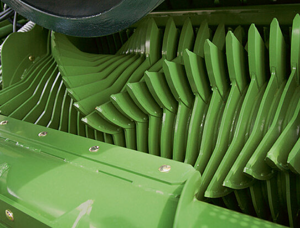 KRONE griešanas sistēma ir aprīkota ar 16 vai 26 asmeņiem, kas nodrošina griešanas garumu līdz 44 mm atkarībā no kanāla platuma. Asmeņi tiek kontrolēti grupās, un centrālā vadība ļauj izvēlēties griešanas garumu, pilns komplekts ar 44 mm vai puse asmeņu ar 88 mm. Asmeņu kassetes hidrauliski nolaižas un izvelkas kā atvilktne ērtai piekļuvei. Plašās un izturīgās 20 mm Hardox plāksnes uz dakšām nodrošina augstu caurplūdi, tīru šķērsgriezumu un ilgu kalpošanas laiku, samazinot jaudas patēriņu un novēršot kultūraugu sapludināšanos. Katram asmenim ir individuāla atsperu aizsardzība pret svešķermeņiem, kas pēc trieciena atgriežas darbības pozīcijā, garantējot nevainojamu darbību. Spēcīgais rotors ar 550 mm diametru un V-veida izkārtojuma dakšām optimāli virza kultūru cauri asmeņiem, vienmērīgi piepildot ruļļu kameru ar minimālu jaudas patēriņu, savukārt griešanas sistēmas piedziņa tiek nodrošināta tieši no galvenās pārnesumkārbas ar iebūvētu pārslodzes aizsardzību.