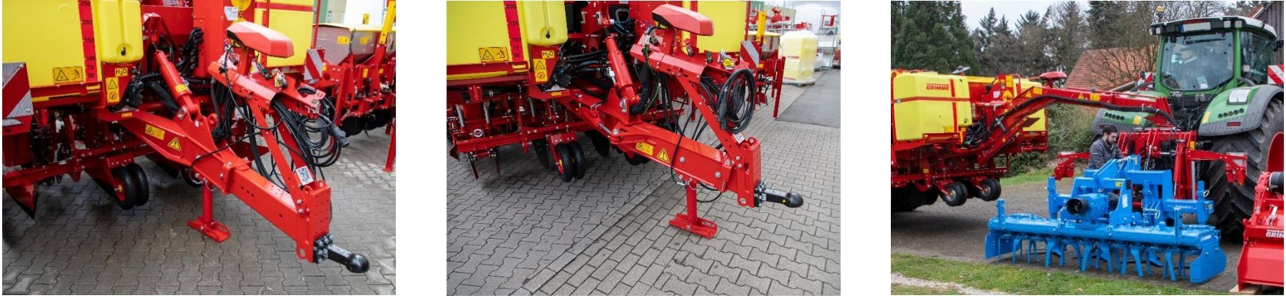 Standarta aprīkojumā iekļauts mehāniski izbīdāms jūgstienis, savukārt papildaprīkojumā pieejams hidrauliski vadāms jūgstienis ar ±20° leņķa korekcijas iespēju, kas būtiski uzlabo manevrētspēju brauciena beigās un atvieglo mašīnas pozicionēšanu uz nogāzēm vai nelīdzena reljefa. Pēc izvēles iespējams aprīkot stādāmo mašīnu ar “zoss kakla” tipa sakabes mehānismu, kas, izmantojot starpposma rāmi ar atsevišķu pacelšanas mehānismu, nodrošina savienojumu ar traktoru un ļauj efektīvi kombinēt stādīšanas iekārtu ar dažādām augsnes apstrādes mašīnām, piemēram, rotācijas ecēšām vai frēzēm.