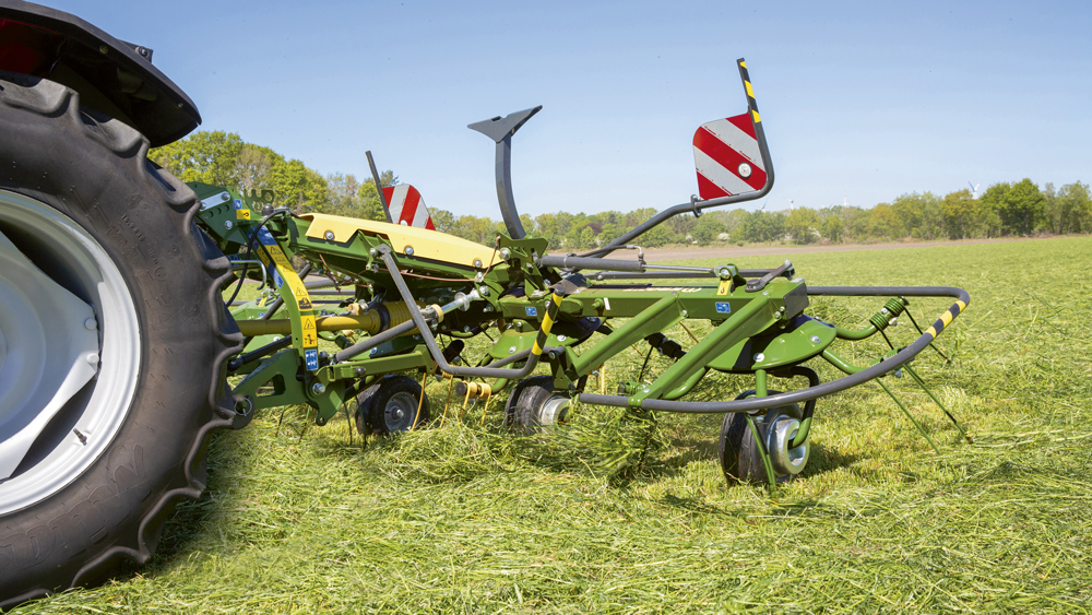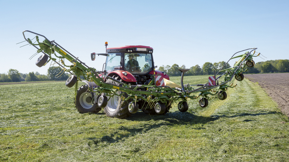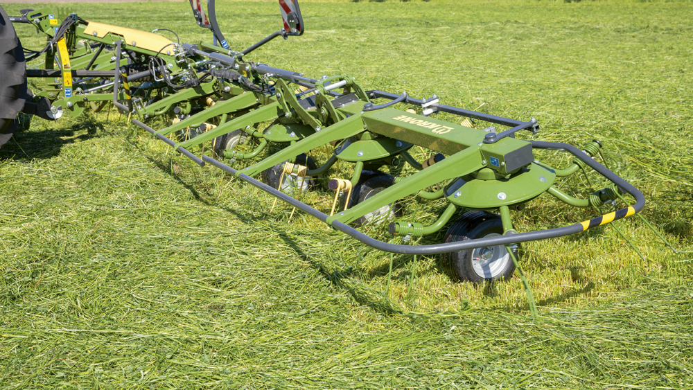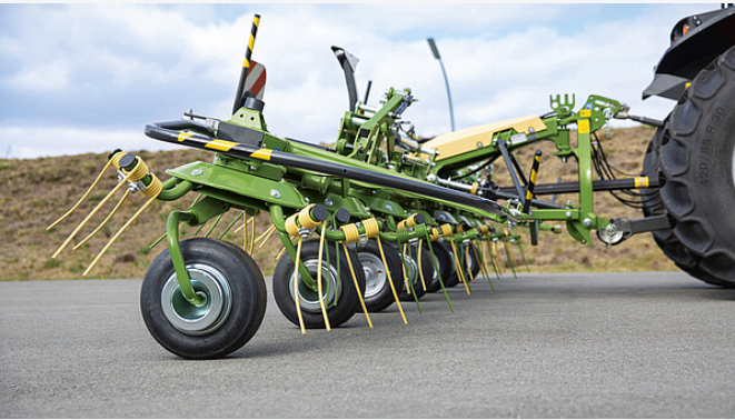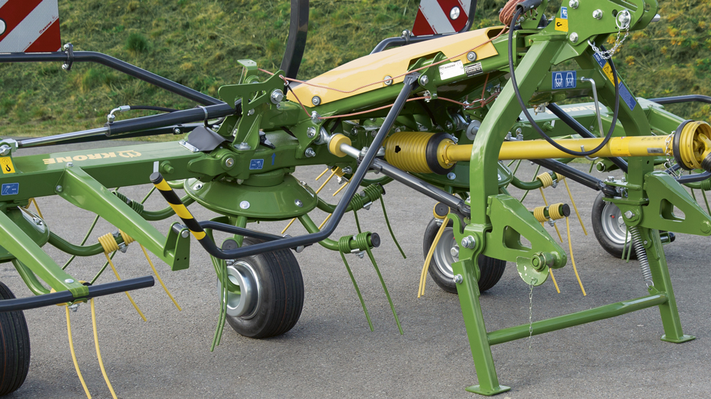 KRONE zāles ārdītāji ir aprīkoti ar LED gaismām maksimālai drošībai uz ceļa un kompakto V-veida rāmi ar trīspunktu uzkari, kas samazina svara pārvietošanos no priekšējās ass. Aizmugurējais statīvs un plats priekšējais balsts nodrošina stabilitāti un paceļ riteņus no zemes. Viegls, ieslīps plastmasas pārklājums veicina pašattīrīšanos, bet iestatījums darbam lauka malā novērš atkārtotu apstrādi. Automātiski salokāmi aizsargstieņi saglabā manevrētspēju darba pozīcijā, galvenais reduktors ar brīvrumbu novērš rotora pēkšņu apstāšanos, bet mehāniski vai hidrauliski amortizatori nodrošina stabilu darbību un optimālu izkliedi.